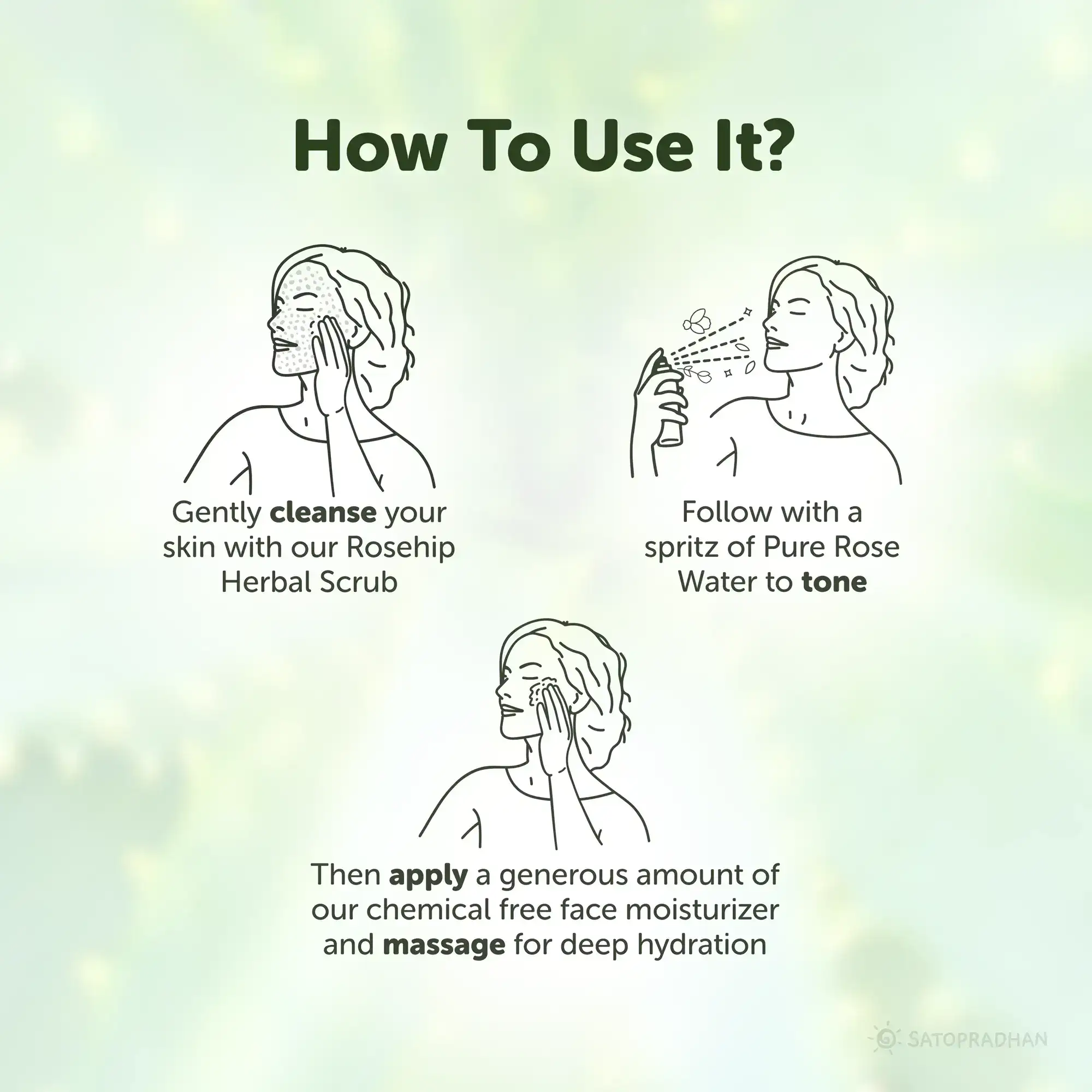 Gently cleanse your skin with our Satopradhan Rosehip Herbal Scrub. Follow with a spritz of Satopradhan Pure Rose Water to tone, then apply a generous amount of our chemical-free face moisturizer and massage for deep hydration.
