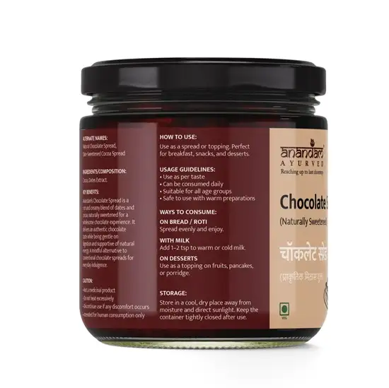 Ingredients: Dates Extract (Khajoor), Cocoa Key Benefits: Anandam’s Chocolate Spread is a rich and creamy blend of dates and cocoa, naturally sweetened for a wholesome chocolate experience. It delivers an authentic chocolate taste while being gentle on digestion and supportive of natural energy. A mindful alternative to conventional chocolate spreads for everyday indulgence. How to Use: Use as a spread or topping. Perfect for breakfast, snacks, and desserts. Usage Guidelines: • Use as per taste • Can be consumed daily • Suitable for all age groups • Safe to use with warm preparations Ways to Consume: On Bread / Roti Spread evenly and enjoy. With Milk Add 1–2 tsp to warm or cold milk. On Desserts Use as a topping on fruits, pancakes, or porridge. Storage: Store in a cool, dry place away from moisture and direct sunlight. Keep the container tightly closed after use. Shelf Life: Best before 12 months from the date of packaging. Caution: • Not a medicinal product • Do not heat excessively • Discontinue use if any discomfort occurs • Intended for human consumption only