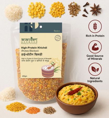 Usage: Soak Anandam’s High-Protein Khichdi for half an hour in five times water, then boil it in the same water along with a few drops of oil/ghee and add some rock salt, black pepper, dry ginger powder, dried pomegranate powder, coriander powder, red chilli powder (optional), and boil with a lid until it’s cooked properly.