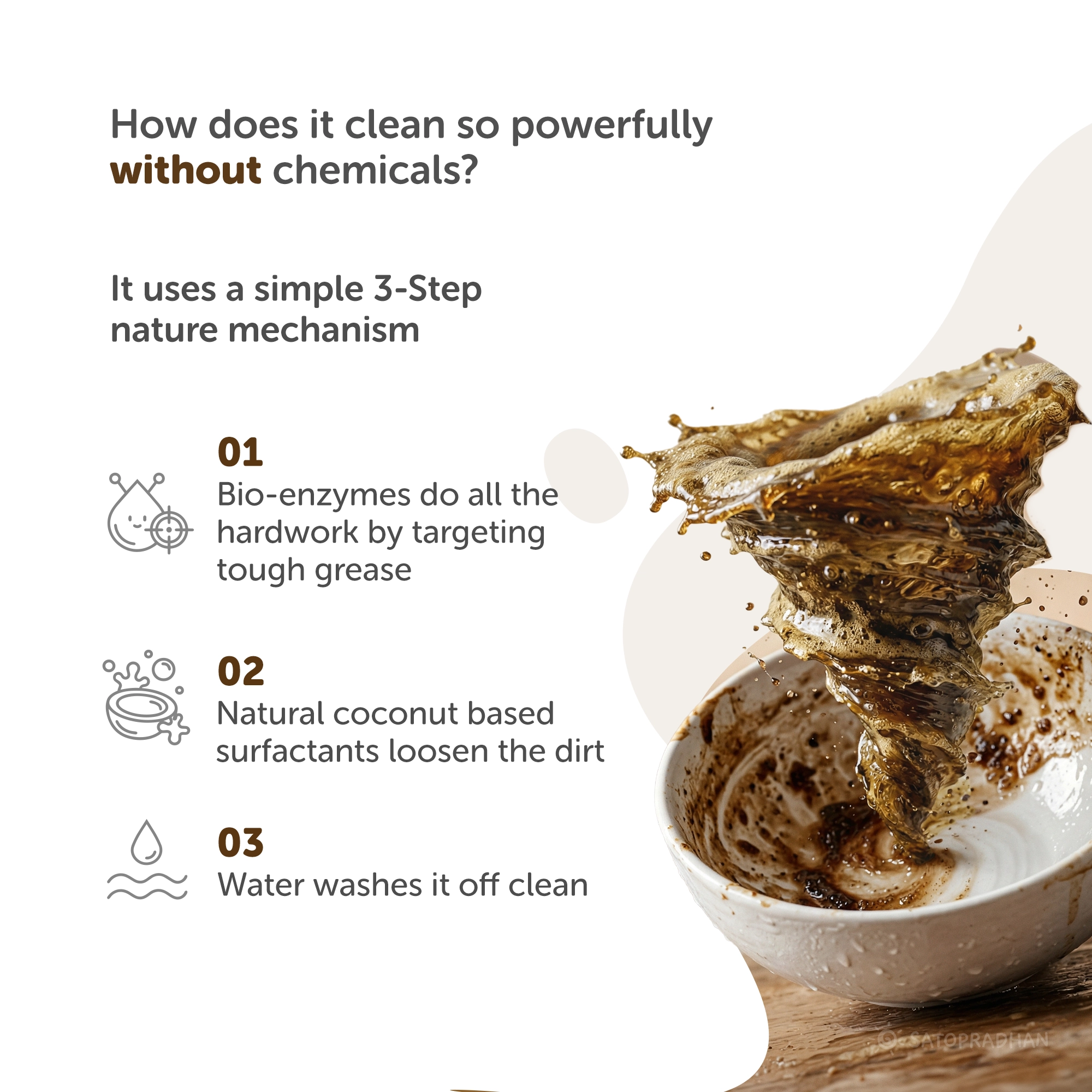 - No Toxic Residue: Unlike conventional dishwash liquids, which may leave behind chemical residue, this non-toxic dishwashing liquid rinses clean. Your plates remain food-safe, making them ideal for everyday meals in Indian homes—especially for babies and families.