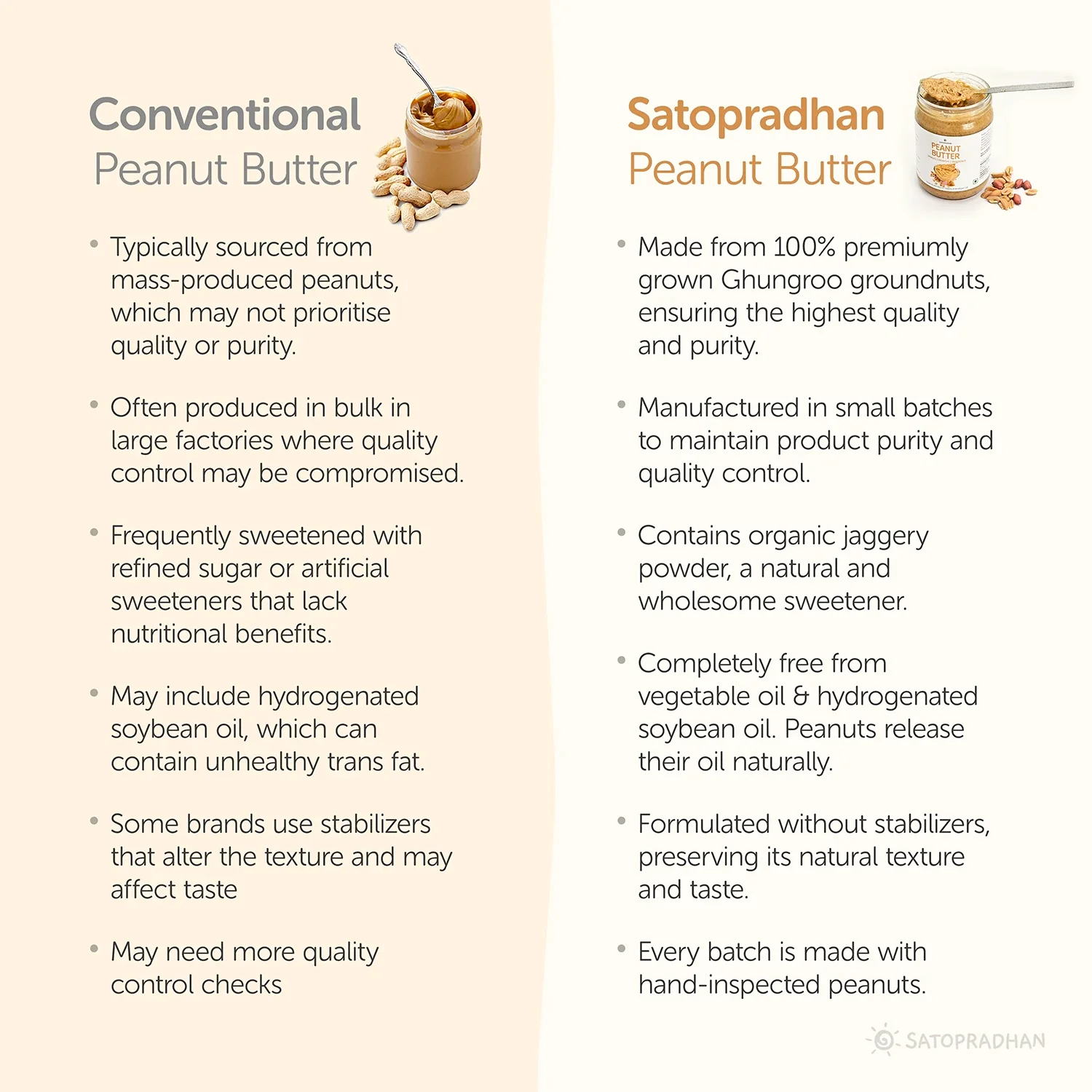 Note: This peanut butter is 100% natural and free from stabilisers, so oil separation and jaggery settling at the bottom are natural signs of purity. On opening, stir thoroughly from the bottom with a large spoon to maintain a smooth texture.