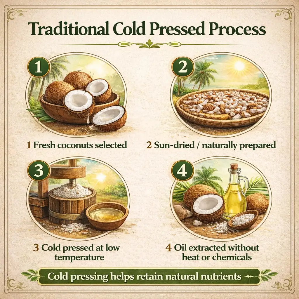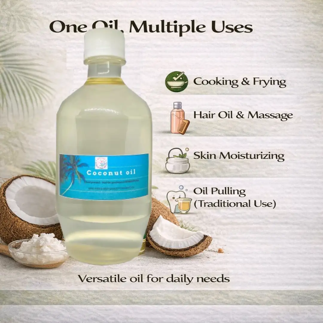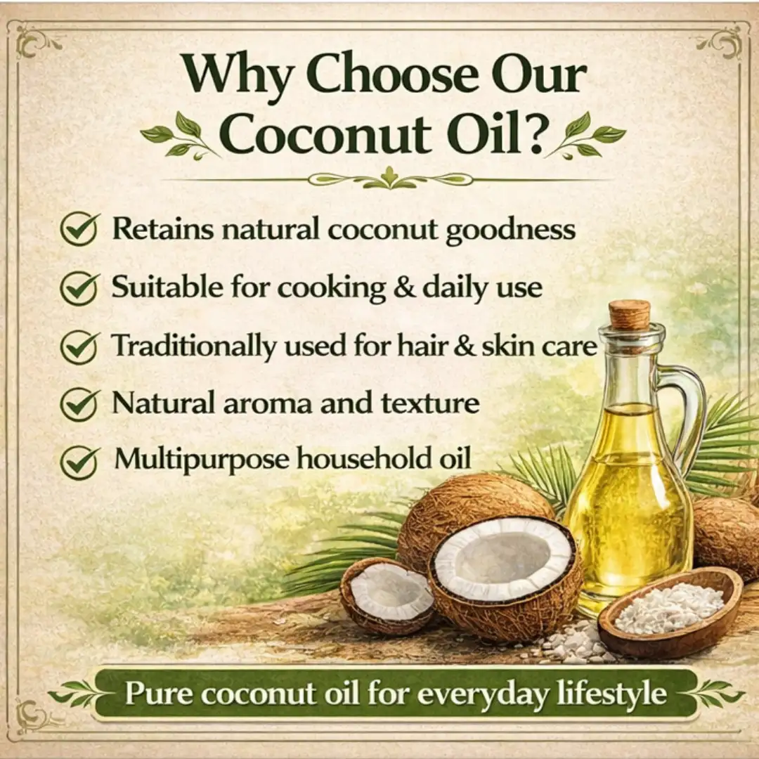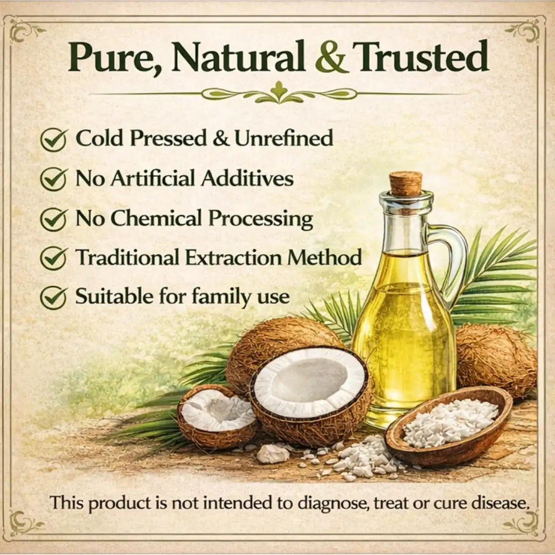 कोल्हू से निकला साफ और शुद्ध नारियल का तेल| आप इसे खाने में भी प्रयोग कर सकते है| यह १००% शुद्धता के साथ बना है|